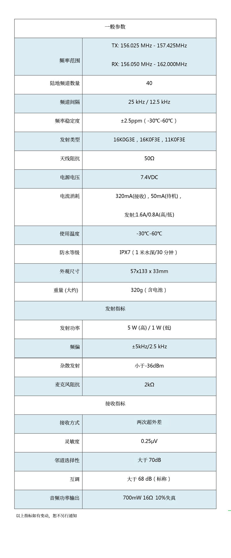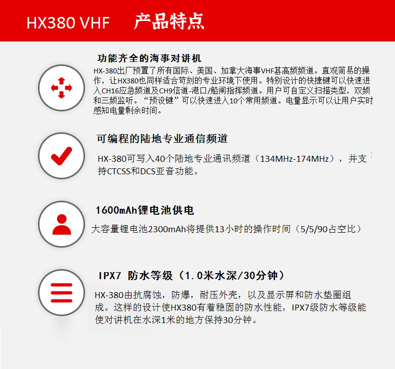 - 40個可編程陸地通信頻道 - 1600mAh 大容量鋰電池,交流快速充電器 - 5W/1W 輸出功率 - IPX7 防水等級(1.0米水深30分鐘不進水) - 700mW 大音量內置揚聲器 - 按鍵大,屏幕大