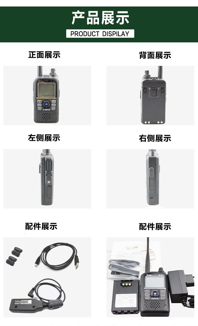 144MHz/430MHz雙顯雙待,FM收音機功能,內置GPS,D-STAR DV模式可傳輸語音和數據,錄音功能(需配microSD卡)。IPX7防水設計,一米水深可放置半小時。